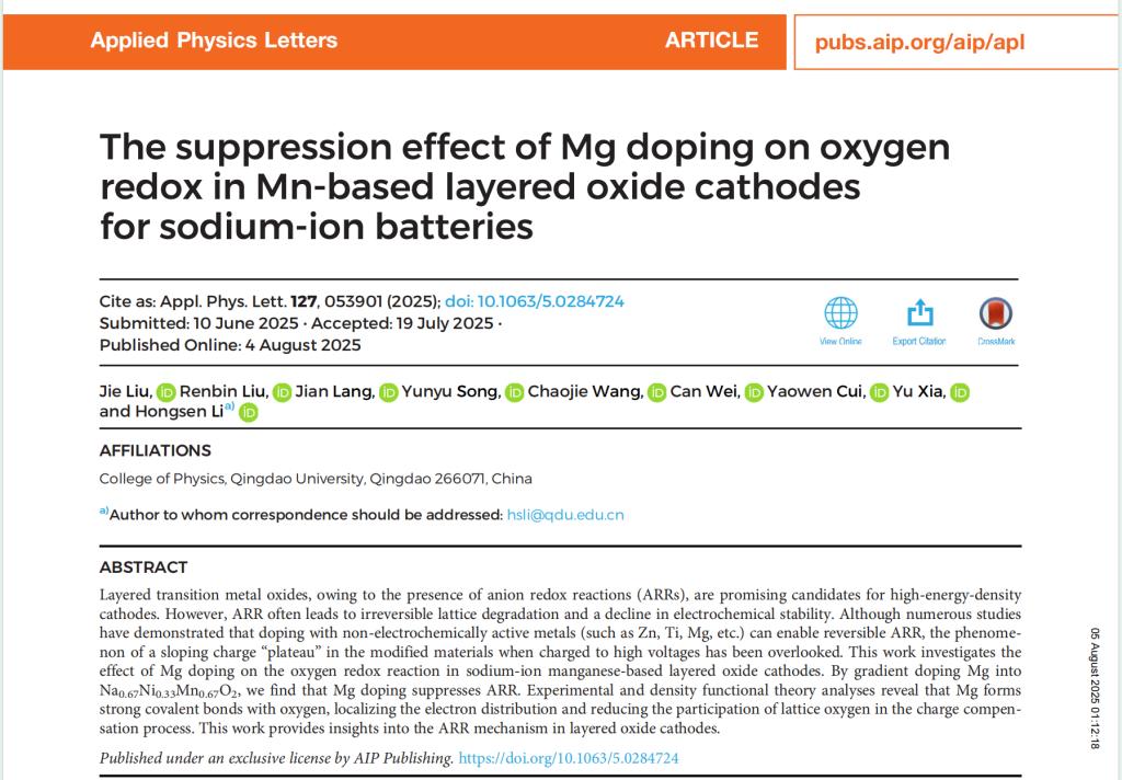 李洪森教授团队在钠离子电池层状正极材料研究领域取得新进展,团队发表在物理领域自然指数收录期刊Applied Physics Letters上的研究成果,凭借广泛的学术关注度与社会影响力,荣获美国物理联合会“AIP Publishing 2025年度社交媒体影响力论文奖”。